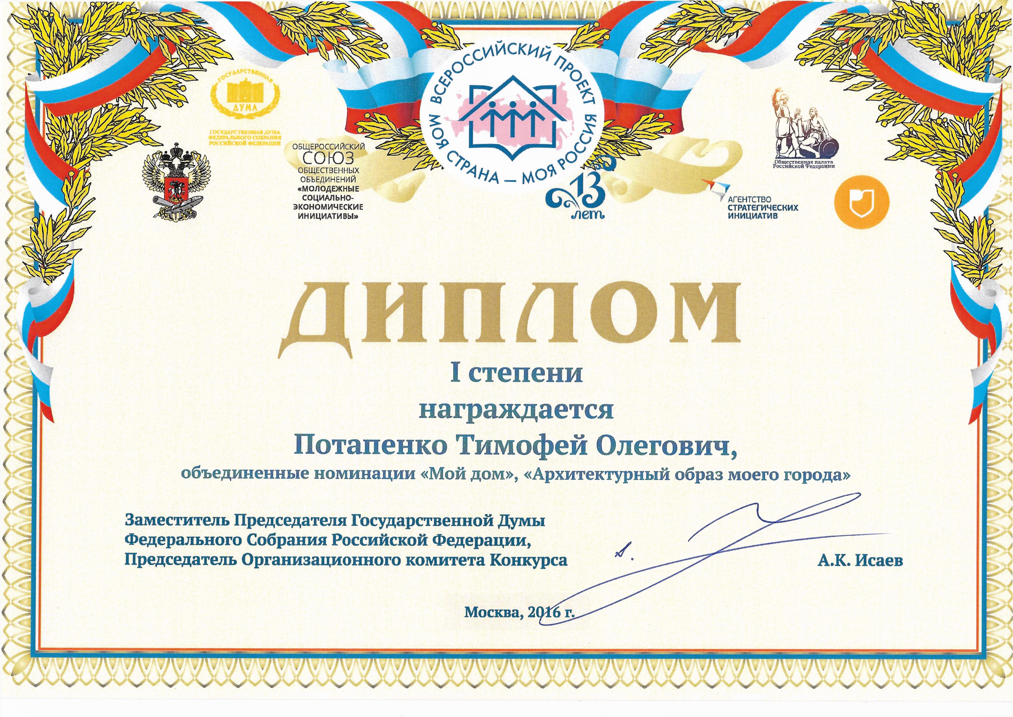 15 июня 2016 года Потапенко Тимофей Олегович, воспитанник объединения "Регата" ЦДТ пгт.Новомихайловский (руководитель Мурадян Светлана Карповна), стал победителем Всероссийского конкурса молодежных авторских проектов и проектов в сфере образования, направленных на социально-экономическое развитие российских территорий «Моя страна – моя Россия» в номинации «Мой дом», специальной номинации «Архитектурный образ моего города» с проектом «Проект на 1 000 лет». Поздравляем победителя и его педагога! Так держать!